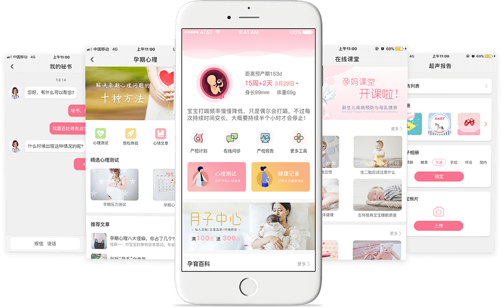 智慧孕产功能齐全,其中包括智能健康监测、健康报告分析、报告查询、孕育百科、心理疏导、宝宝电子相册、在线小秘书、孕妈妈课堂等。